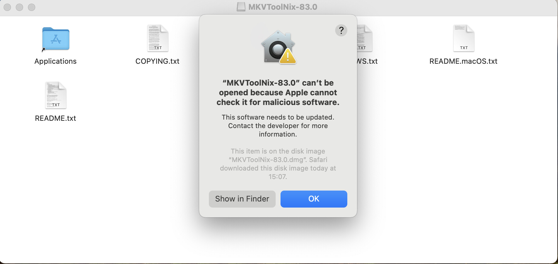 Worked if you go to System Settings>Privacy&Security>Popup for MKVToolNix will be there on M-series machines. Click on “Open Anyway”